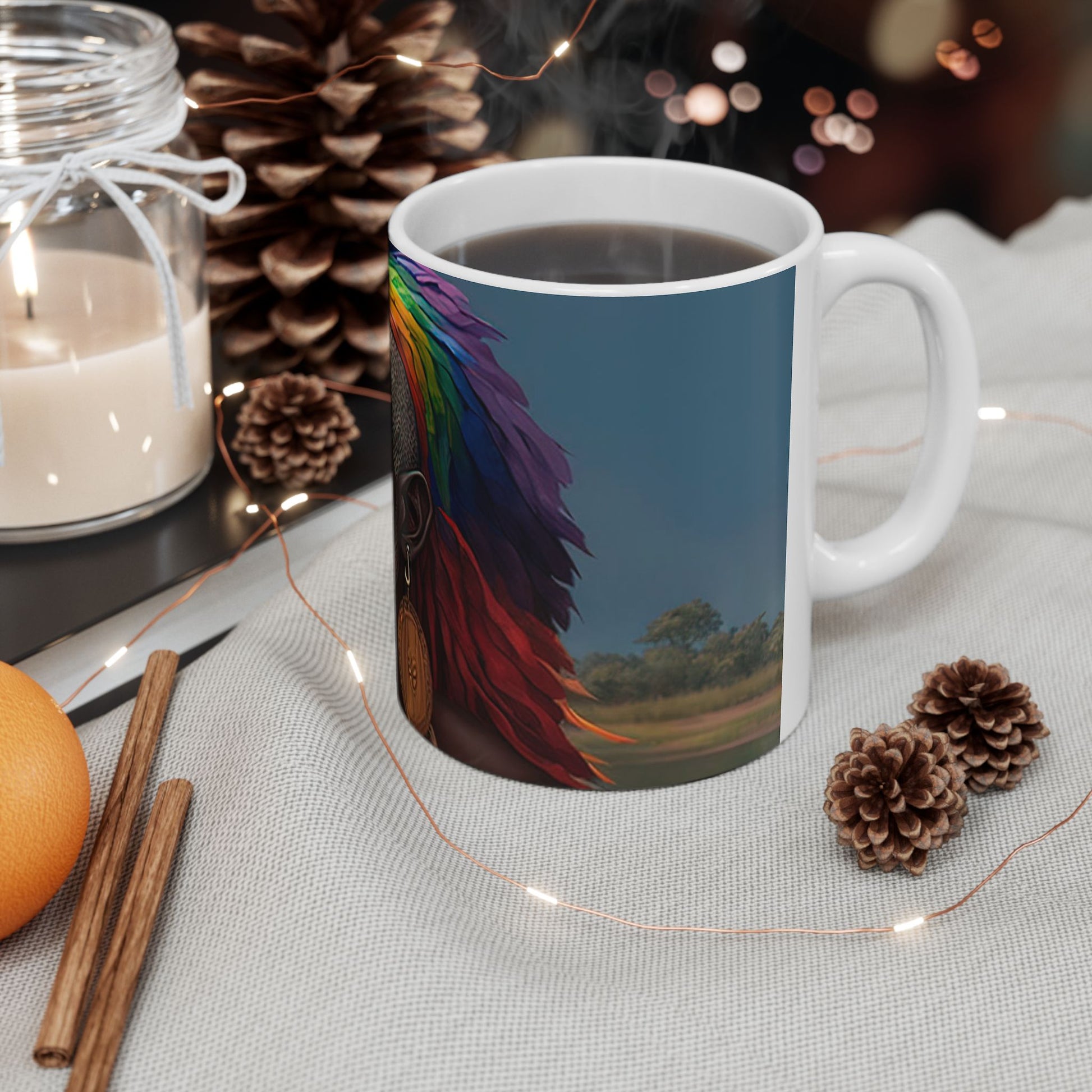 Savor your favorite beverages in our Osumare Orisa ceramic mug. This 11-oz white ceramic mug celebrates the spirit of Osumare Orisa, bringing a touch of tradition and reverence to your daily routine.