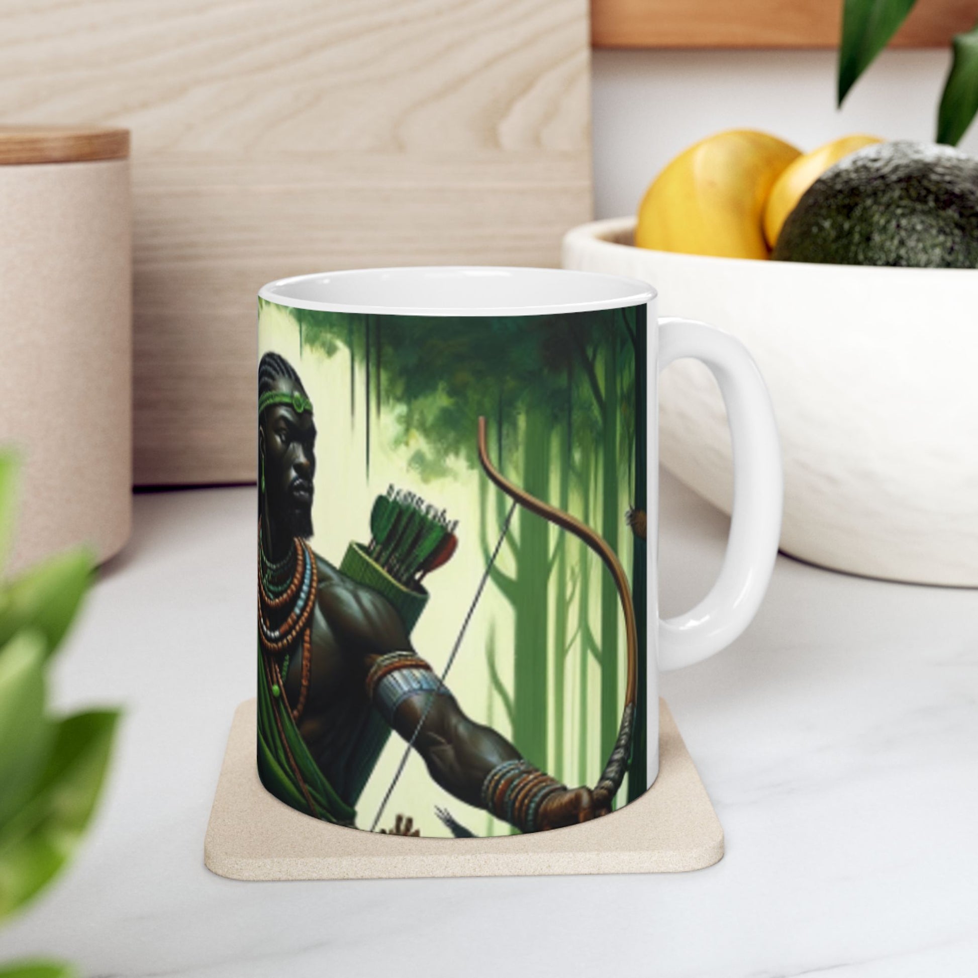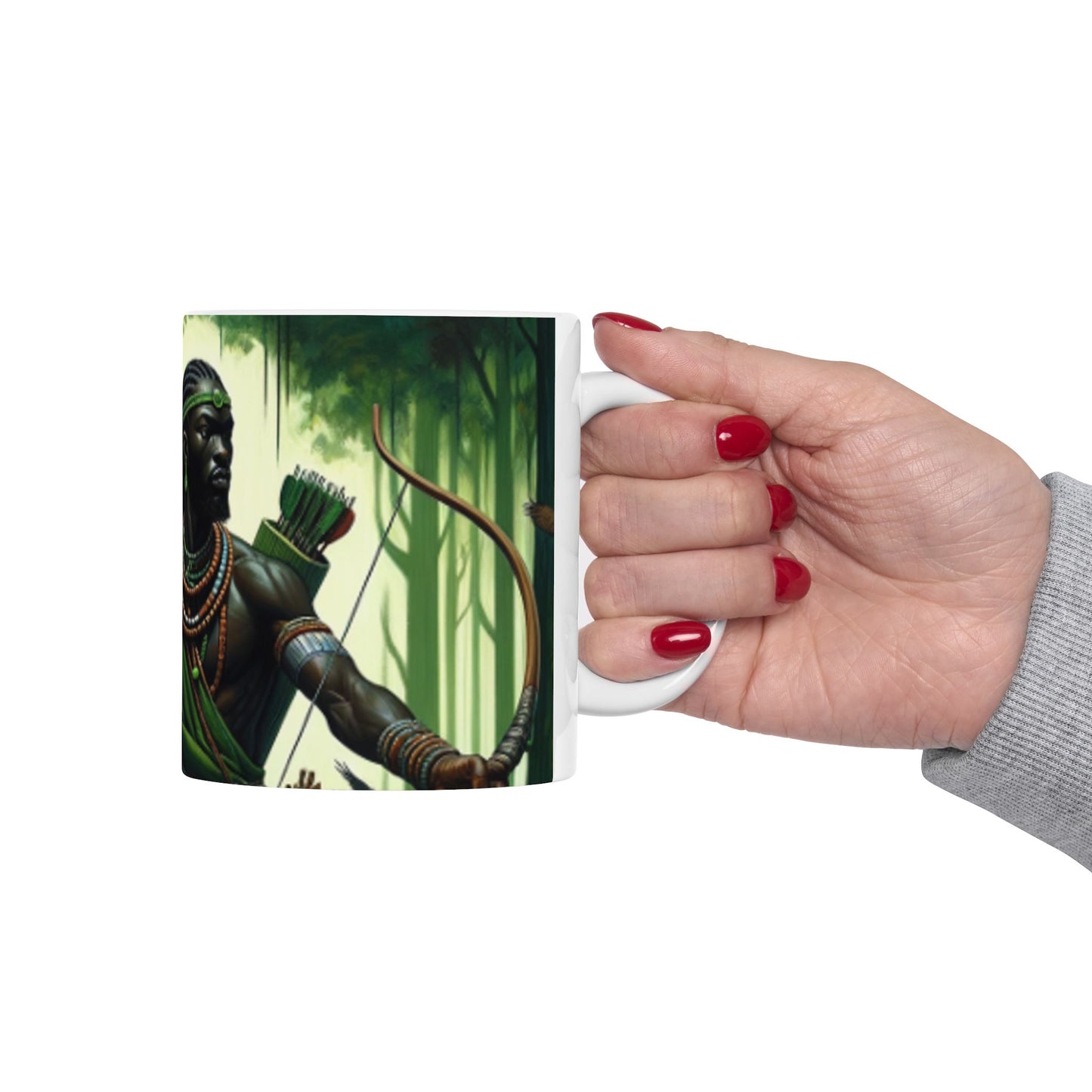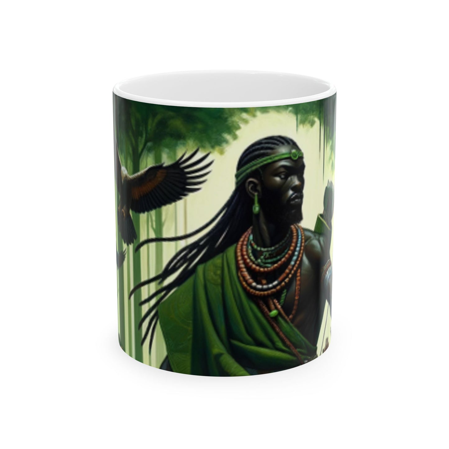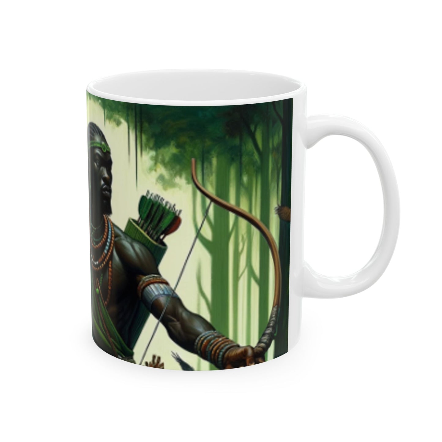 Embrace the spirit of Osoosi Orisa with our 11-oz ceramic mug. Perfect for your daily brew, this mug offers a blend of tradition and style, making each sip a moment of reverence and relaxation.