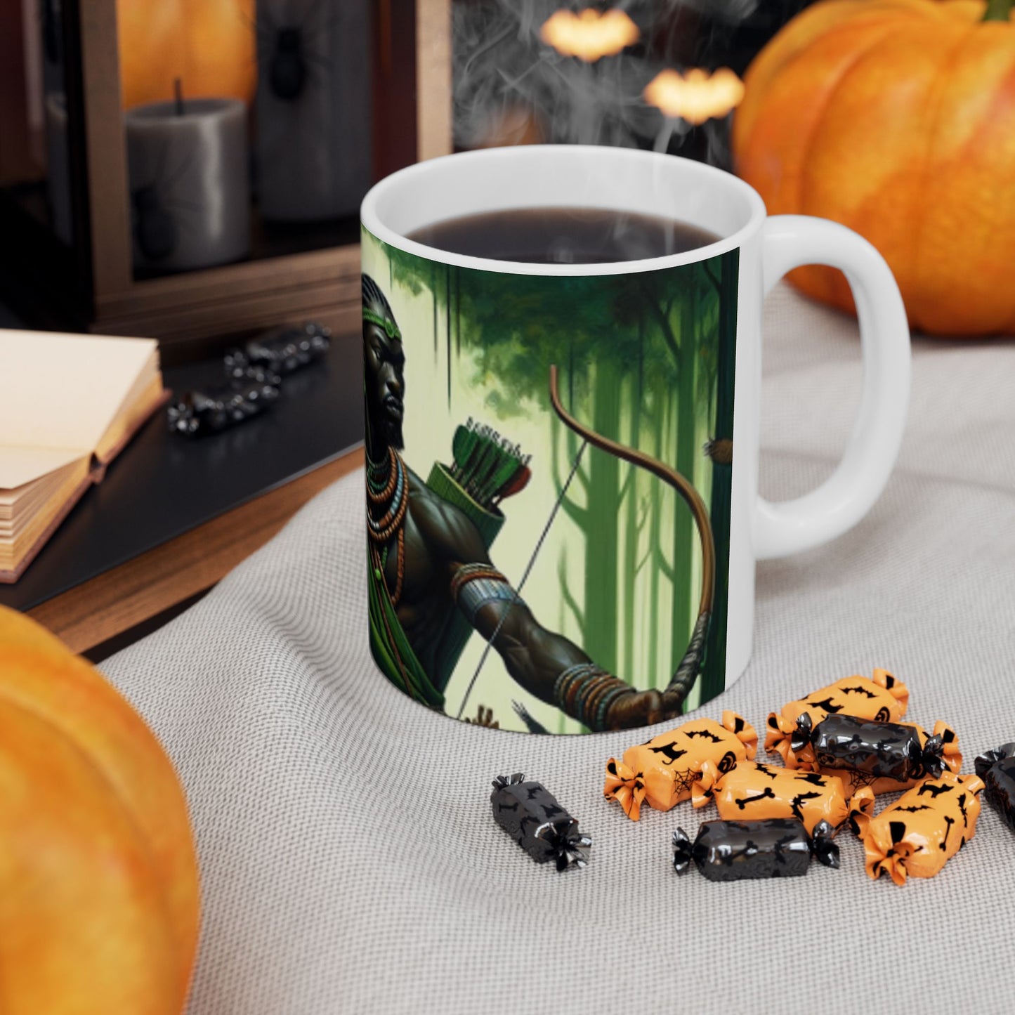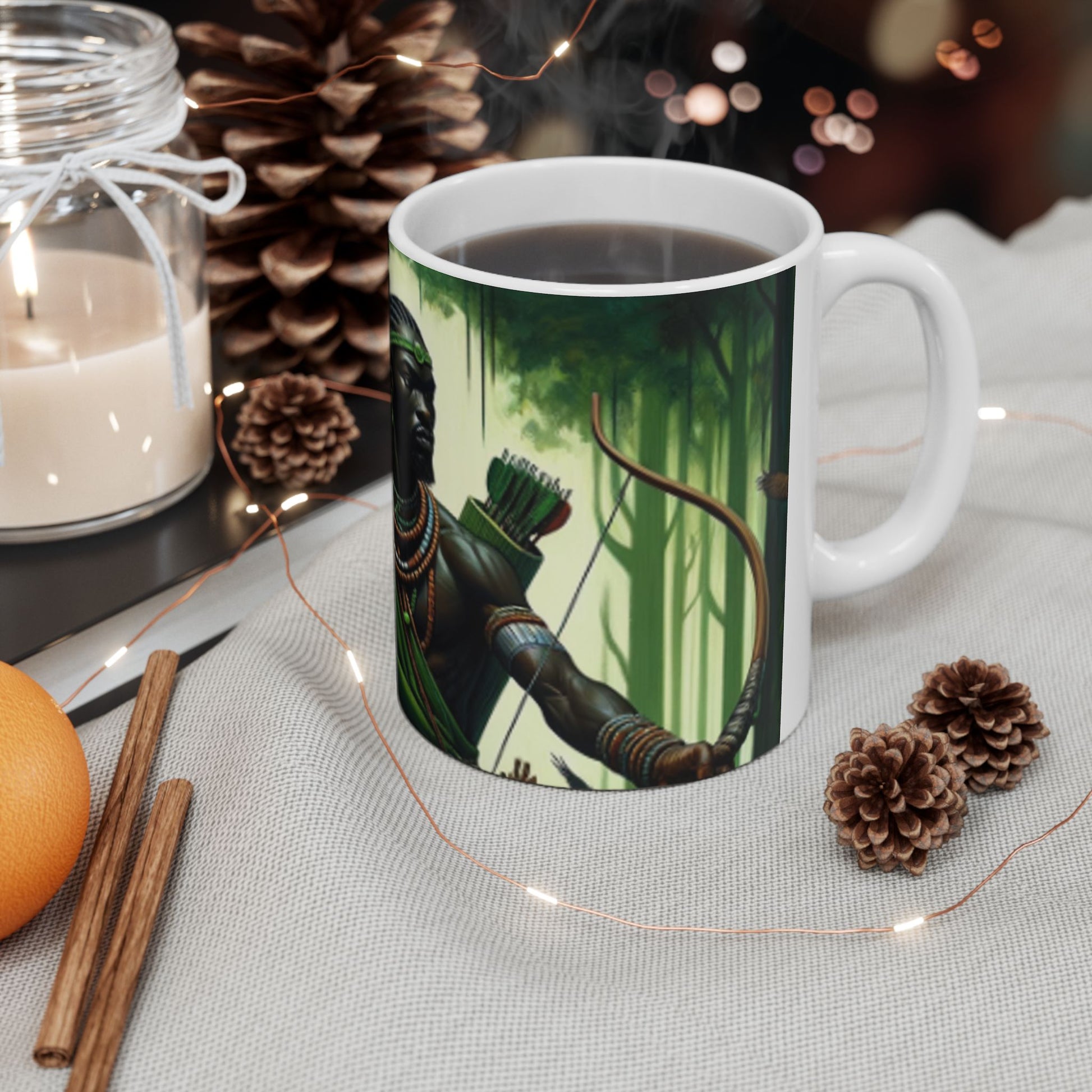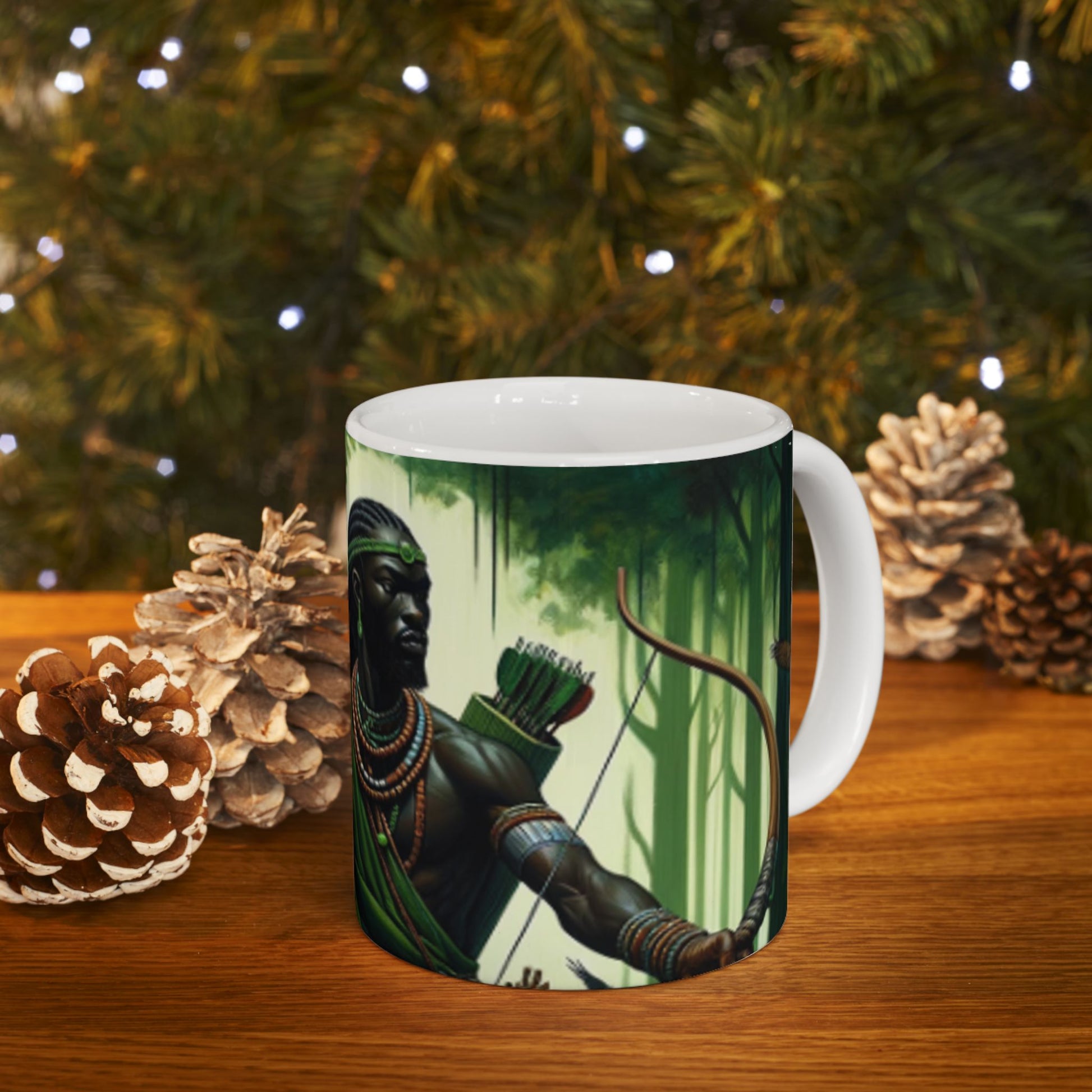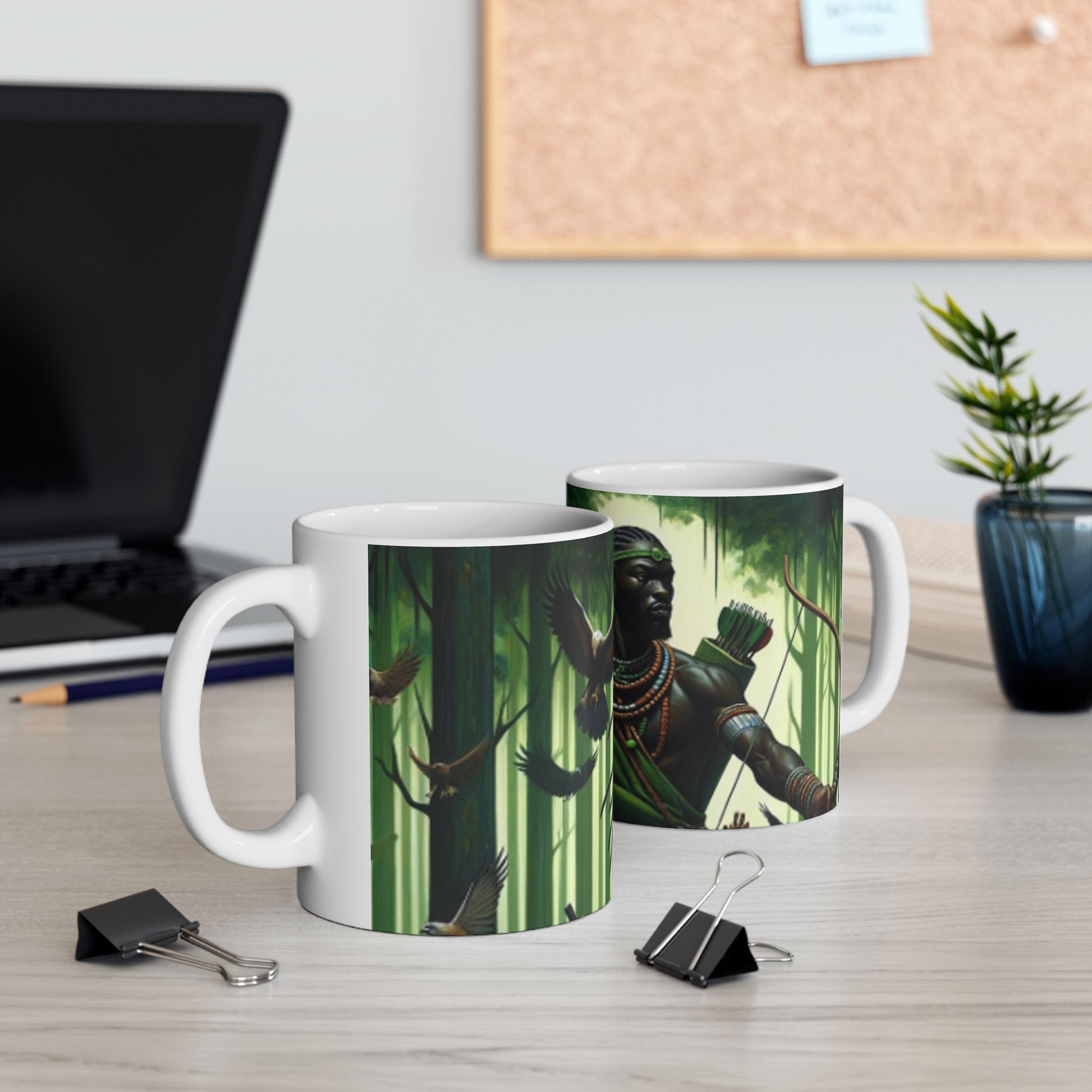 Embrace the spirit of Osoosi Orisa with our 11-oz ceramic mug. Perfect for your daily brew, this mug offers a blend of tradition and style, making each sip a moment of reverence and relaxation.