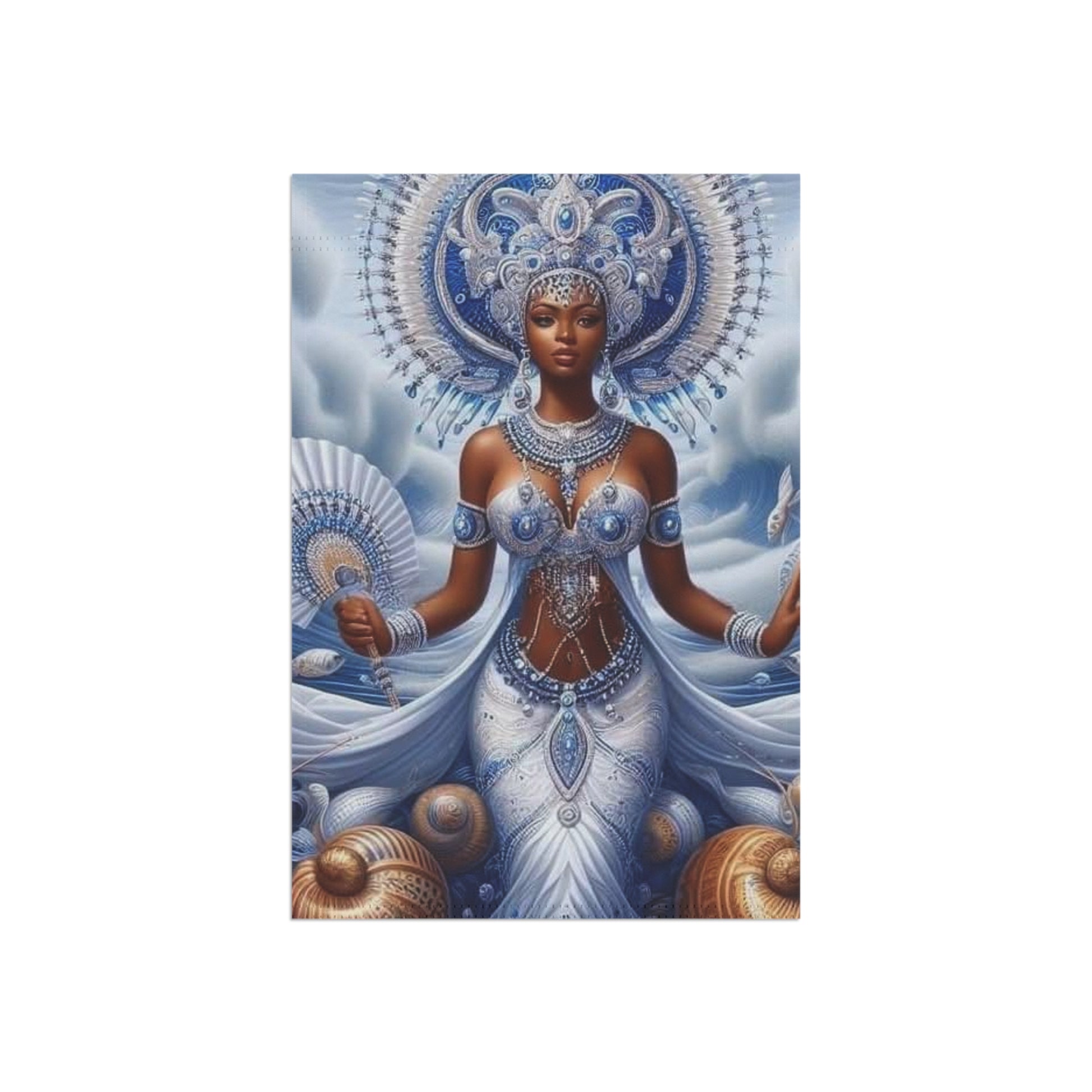 Elevate your living space with the Orisa Yemoja Garden and House Banner. Inspired by the mystical essence of Yemoja, the Yoruba goddess of the oceans and motherhood, this banner embodies tranquility and protection. Crafted with vibrant colors and intricate designs, it showcases Yemoja's nurturing spirit, bringing a sense of harmony and serenity to any environment. Whether displayed in your garden or adorning your home, this banner serves as a beautiful tribute to Yemoja's timeless wisdom and grace. Embrace the beauty of tradition and nature with the Orisa Yemoja Garden and House Banner.